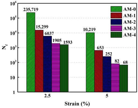 Table 4 lists the VECD model parameters of the MFAMs. As shown in the table, microwave heating promotes C2 and diminishes A35 and C1, and it has little influence on α and B. Figure 13 presents the fatigue life of the MFAMs at the strains of 2.5% and 5%. As can be seen from the figure, the fatigue life of the MFAMs obviously decreases with an increase in strain and microwave heating time.