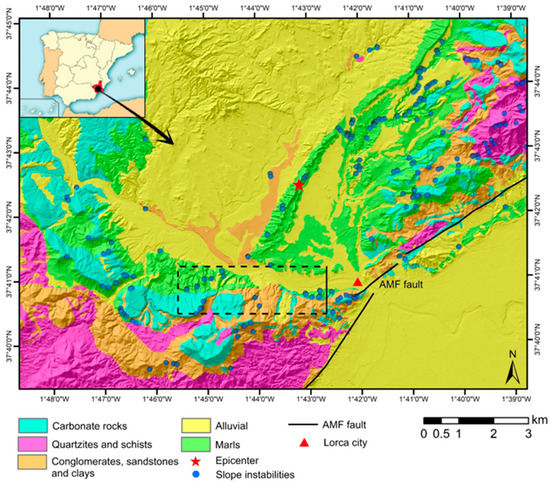 Location map of the study area in Lorca. Lithological groups affected by slope instabilities related to the 2011 Lorca earthquake are shown (blue dots). The rectangle of the striped lines corresponds to the area shown in Figure 10. AMF: Alhama de Murcia Fault.