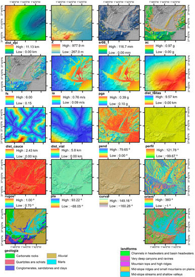 In this study, the existing landslide inventories were merged. This resulted in a total of 257 slope instabilities with different volumes, ranging from one to hundreds of cubic meters. Each mapped slope instability was used to obtain relevant information for landslide control. The parameters used to control the landslide occurrence are shown in Table 1 and Figure 2. They are grouped into eighteen factors, which provide information about the terrain, location, and seismic parameters that contributed to the landslide triggering.