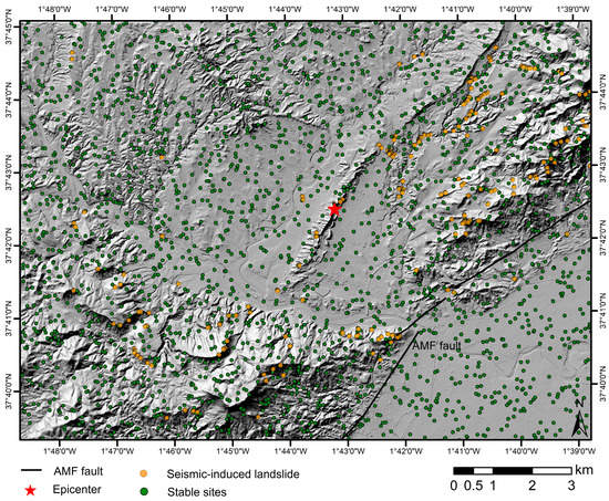 Alfaro et al. covered an area of around 100 km2 around the epicenter [5]. They observed that most of the landslides were in the NE-SW and N-NW mountainous fronts and mainly comprised rockslides. The genesis of the sliding materials varied depending on the size of the mapped instability.