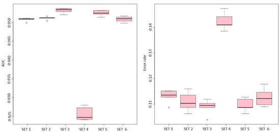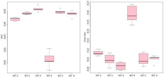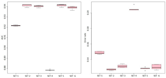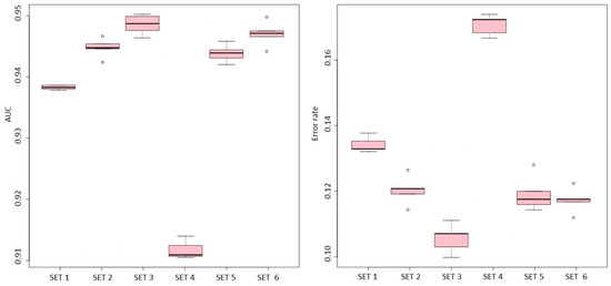 where corresponds to the average error rate of all classes, and refers to the average area under the ROC curve for all obtained classes. This approach provides an overall evaluation of the model’s performance that considers both its ability to distinguish between classes and its accuracy in classifying each class. By combining these two metrics, a more comprehensive assessment of performance can be obtained.