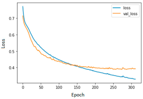 The stopping criterion plays a crucial role in ANN performance: it indicates when to stop the training process. In this study, cross-validation was used as the stopping criterion [60]. This technique involves dividing the data into training and validation sets and then evaluating the model’s performance on the validation set at each stage of training. To do this, the loss and val-loss curves are plotted throughout different training epochs. As these curves descend, the model correctly generalizes. The training process stops when the loss curves start to increase because the following epochs cause an overfitting of the model.
