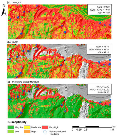 Figure 10 compares the co-seismic slope instability susceptibility maps of the two best models in terms of the SR indicator (ann_cp and svmr) for the model constructed from principal components (Figure 10a) and that developed without principal components (Figure 10b), with the susceptibility map obtained using the physical-based method performed previously in [27] in the same area (Figure 10c).