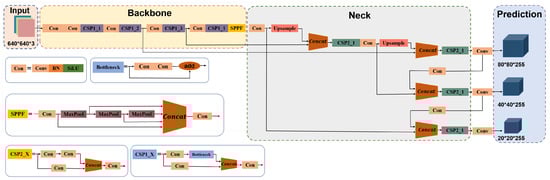 - Backbone: The backbone network comprises a Con structure, Batch Normalization (BN), and SiLu operations. It includes CSP1_X blocks and a SPPF (Spatial Pyramid Pooling-Fast) module. CSP1_X blocks concatenate different convolutions to extract valuable features from the input image. The network applies a Convolution module with a size of 3 and a step size of 2 to extract image features, producing an output image of size 160 × 160 × 128. Three groups of CSP1 and Conv layers further enhance feature extraction, resulting in a feature map of size 20 × 20 × 1024. A bottleneck structure improves detection accuracy. An SPPF module is incorporated to enhance the accuracy of the 20 × 20 feature map, capturing features at multiple scales and improving object detection accuracy.