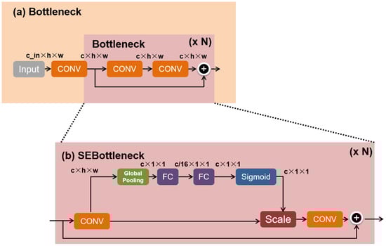 Figure 3 illustrates the integration of the Squeeze-and-Excitation (SE) module, which serves as a channel attention mechanism. The SE module is added to the original residual block as an additional pathway. It computes the initial channel weights via the global pooling layer and subsequently refines them for each channel using two fully connected layers and a sigmoid activation function. Finally, the original channel is multiplied by the weights for each channel, leading to improved detection accuracy during the learning and training process through the gradient descent method in the network. The formula for the squeezing operation is shown below:
