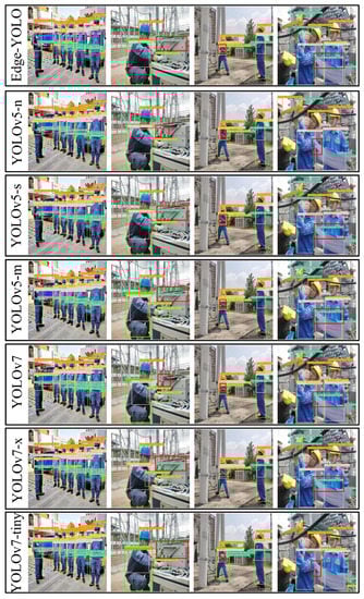 After optimizing the entire dataset, the same validation dataset was used to compare the detection performance of seven models in terms of both speed and accuracy. The objective of this paper was to find a YOLO model that is more suitable for embedding in edge devices and better aligned with the requirements of actual power construction site inspection detection. The training precision trend of the seven models during the first 200 epochs is presented in Figure 6, where Edge-YOLO maintained relatively stable accuracy across 200 rounds of training and demonstrated an improvement in accuracy when compared to the YOLOv5s model. Furthermore, Table 6 demonstrates that the YOLOv5n and YOLOv7-tiny models have a simpler structure and faster detection speed compared to the other models. According to the performance comparison and analysis of the models in the table, the number of FLOPs and parameters of YOLOv5n and YOLOv7-tiny are less than YOLOv5s, which will save some memory space. However, their detection precision and recall are poor, with YOLOv7-tiny in particular showing the worst accuracy. The YOLOv7x, YOLOv7, and YOLOv5m models, on the other hand, have more complex structures with a large number of FLOPs and parameters, demonstrating superior detection accuracy. Nevertheless, their detection speed is slower, making them unsuitable for embedding in edge devices that require real-time performance and greater portability. Compared to both YOLOv7 and YOLOv5 series models, the YOLOv5s model offers faster detection speeds without compromising on Precision, Recall, mAP@.5, and mAP@.5:.95 metrics. Figure 7 shows the detection results of these models in the test dataset, indicating that the YOLOv5s model performs comparably to other more complex YOLO series models, but with significantly better detection accuracy than the lighter YOLOv5n and YOLOv7-tiny models. After carefully evaluating the accuracy performance close to YOLOv5m and the speed performance close to YOLOv7-tiny on edge devices, we have chosen the YOLOv5s model as our detection model to enhance compliance with real-time detection systems for on-site power construction workers. To achieve this, we proposed a novel object detection model called Edge-YOLO, which is built upon the YOLOv5s object detection algorithm and offers improvements in both detection speed and accuracy. In Figure 7, we additionally showcase the detection performance of the safety gloves to illustrate the aforementioned results. The utilization of red boxes in the figure serves to differentiate between the various types of detectors. Based on the results of safety-gloves detections, it can be observed that the YOLOv5n and YOLOv7-tiny models exhibit lower accuracy, increased false positives, and missed detections. In comparison, the detection performance of Edge-YOLO is superior to them.