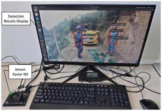 (3) Detection Result Display and Non-standard Dress Warning: A high-definition display and voice warning device can be connected to the Jetson Xavier NX via the USB terminal or wireless network. This setup allows for real-time monitoring of electric workers’ illegal wearing practices through video or voice alerts.
