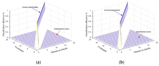 Four series of experiments are developed for each texture descriptor. In the first series, type 1 carcinogenic images are identified. In the second and third series, types 2 and 3 are identified. To conclude, in the fourth series of experiments, all carcinogenic images are combined and subsequently identified. The results are expressed through a confusion matrix , where the main diagonal elements denote the correct classification predictions; the elements surrounding the diagonal describe the identification error; the columns correspond to the carcinogenic images; and the rows correspond to the prototypes [49]. Figure 7a–d illustrates the projections of four confusion matrixes when the LBP histogram is employed as characteristic vector, and the carcinogenic images are classified with it.