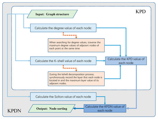 In summary, the above operations can form an initial dictionary during the first traversal of K-shell for storage and constantly call to save calculation time. Therefore, from a theoretical analysis, the computational complexity of the proposed method in this paper should be close to the K-shell method. Therefore, it is determined that this method is more suitable for large-scale networks. The KPDN method is shown in Figure 1.