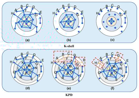 The K-shell decomposition method proposed by Kitsak et al. [19,20,21] is a graph-theoretical algorithm used to decompose an undirected graph into multiple K-shell subgraphs. A K-shell subgraph refers to a subgraph composed of nodes with degrees greater than or equal to k in the graph; that is, any node in the subgraph has a degree greater than or equal to k. The core idea of the algorithm is to repeatedly prune the nodes with the smallest degrees and update the degrees of their adjacent nodes until all nodes are decomposed into K-shell subgraphs.