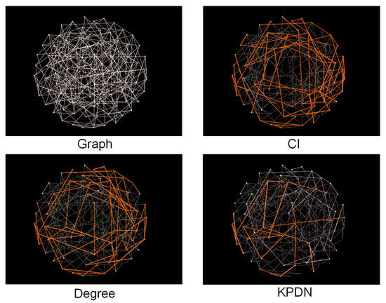 Based on the node sorting values generated by different algorithms, after deleting the nodes ranked in the top 40%, respectively, the largest connected subgraph of the remaining nodes was annotated and compared, and the largest connected subgraph in each figure was marked in red for easy identification, as shown in Figure 3.