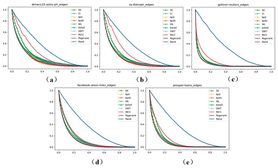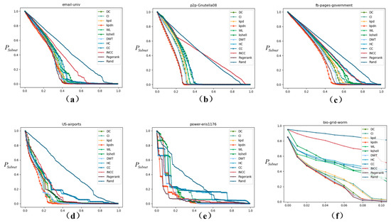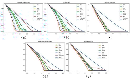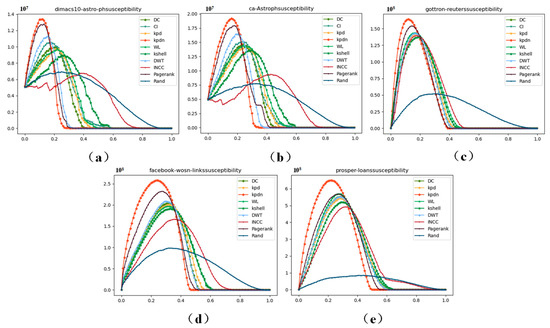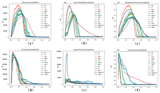 Taking Figure 5b as an example, when the peak appears, the proportion of nodes removed is: KPDN: 11.46%, PageRank: 12.94%, DWT: 18.81%, Degree: 18.83%, KPD: 22.05%, INCC: 22.16%, CI: 22.46%, WL: 22.91%, K-shell: 24.33%, HC: 24.20%, CC: 24.43%, Random: 24.81%. Similarly, in Figure 5b,c,f, it can be seen that the network can be quickly fragmented by deleting fewer nodes. At the same time, it can also be observed from Figure 5a,d,e that the proposed method is in a leading position. Therefore, the proposed method in this paper has an obvious effect on the change in the susceptibility index of the subgraph.