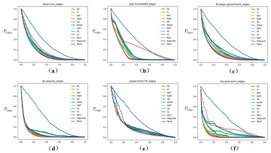The decrease rate of network edges affected by different network disintegration strategies (proportion of remaining subnet edges. The horizontal axis represents the proportion of nodes removed, and the vertical axis represents the remaining ratio of edges in the subnetwork). (a–f) correspond to: (a) email-univ, (b) p2p-Gnutella08, (c) fb-pages-government, (d) US-airports, (e) power-eris1176, and (f) bio-grid-worm.