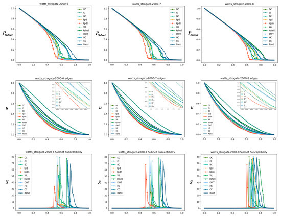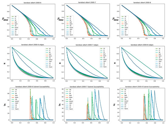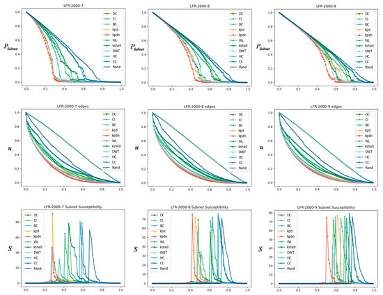 We also checked the performance of the proposed algorithm on synthetic networks with a clear community structure, as shown in Figure 10. The basic configuration obtained by the LFR algorithm is: , , , . In order to compare different average degrees, we set the average degree to 7, 8, and 9, respectively. Each column from left to right corresponds to the LFR networks with an average degree of 2.131, 3.448, and 4.7565, respectively. The first row compares the connected coefficient. The second row compares the remaining connected edges. The third row compares subnet sensitivity. From the figure, we can easily find that the dividing advantage of the method proposed in this paper on the LFR network is still quite obvious.
