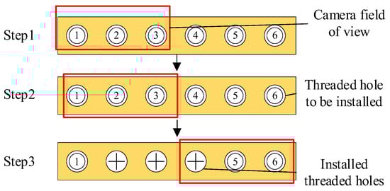 (1) The existing visual-based threaded hole positioning methods pose certain risks in the assembly of dense small screws. The main reason is that due to the complex structure of the manipulator, absolute positioning accuracy is difficult to ensure. On the other hand, high-precision manipulators are costly, making them unsuitable for widespread use in ordinary factories. When the manipulator moves over the threaded holes in the longitudinal direction, it is affected by the accumulation of absolute positioning errors. In particular, this is because the distance between two threaded holes is extremely small. Moreover, the target threaded holes may not be in the center view of the camera, leading to positioning errors; consequently, some screws may not be installed. As shown in Figure 1, when locating threaded hole 1 in Step 1, the camera center is closer to threaded hole 2 because of the motion error of the manipulator. Thus, threaded hole 2 is misjudged as the target threaded hole. As the assembly task progresses, in Step 3, a screw is installed in hole 6. However, because threaded hole 1 is outside the camera view, a screw is not threaded into this hole.
