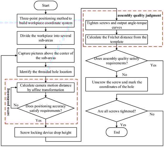 The automatic assembly process for screws is shown in Figure 3. First, the workpiece coordinate system is determined using the three-point positioning method with the support of a laser distance measurer. Second, the workpiece is divided into several sub-areas to ensure that all threaded holes can be captured when the camera moves to the center of the sub-area. Then, a servo-positioning strategy is implemented to achieve the accurate positioning of each threaded hole. Subsequently, the screw-locking device installs the screw. Finally, the screw assembly quality is assessed.
