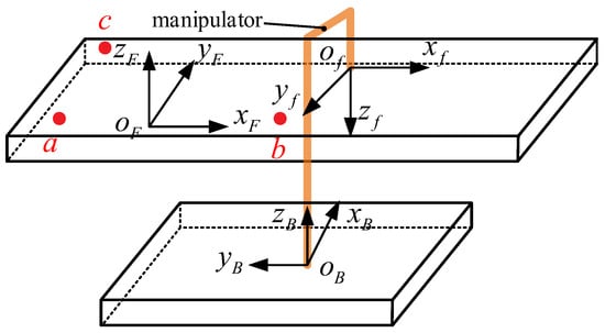 The three-point positioning method was used to establish {F} [19]. First, the industrial manipulator carries the laser distance measurer to position points a, b, and c on the workpiece. As shown in Figure 4, points a and b are two points on one side of the working plane; generally, two points on one side of the workpiece are considered. Point c is a point on the working plane located as far as possible from points a and b. By adjusting the manipulator, the reading of the laser distance measurer at the three positions becomes consistent.