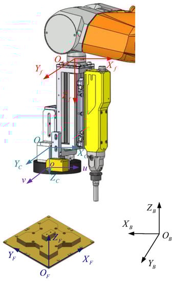 The solution process mainly involves the basic ({B}), flange ({f}), camera ({C}), pixel ({p}), and workpiece ({F}) coordinate systems, as shown in Figure 5. The pose of the camera center in {B} is described by {C}; the optical axis of the camera is the Z axis. Moreover, {p} is a two-dimensional coordinate system that describes the projection of three-dimensional space objects onto the image plane.