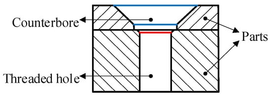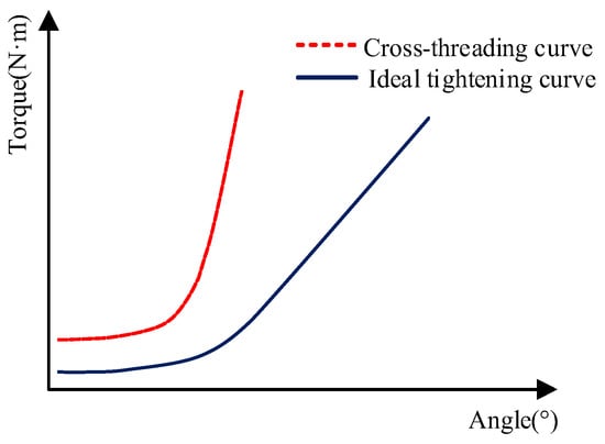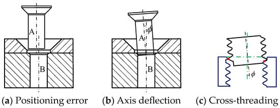 A common assembly defect of this system is that the large location error of the threaded holes causes cross-threading, which occurs in the initial thread-matching stage, as shown in Figure 14. When the positioning error is large, the screw can still be placed in the threaded hole because its diameter is slightly larger than that of the screw. However, the axis of the screw-locking device is at position A, and the screw is limited by the threaded hole such that the axis is deflected, causing the thread to cross. During the tightening process, the screw is subjected to considerable friction, resulting in a high friction torque at the beginning of tightening. The torque reaches a specified value in advance, whereas the preload does not satisfy the requirements, resulting in “false tightening”. The angle–torque curve during assembly is shown in Figure 15.