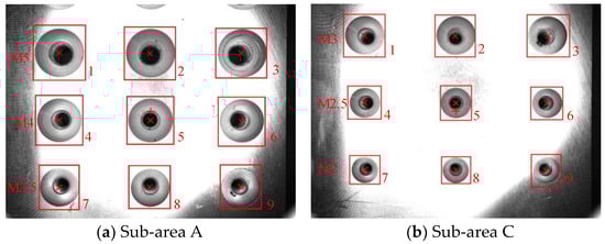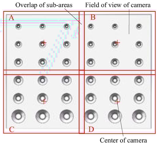 First, the photograph of the sub-area is divided according to the camera’s field of vision and workpiece size. Then, the manipulator is guided to capture pictures above the center of each area alternately. To ensure that all the threaded holes in each sub-area are within the camera’s field of vision, each sub-area is allowed to overlap to some extent, as shown in Figure 11, A–D are examples of sub-areas.