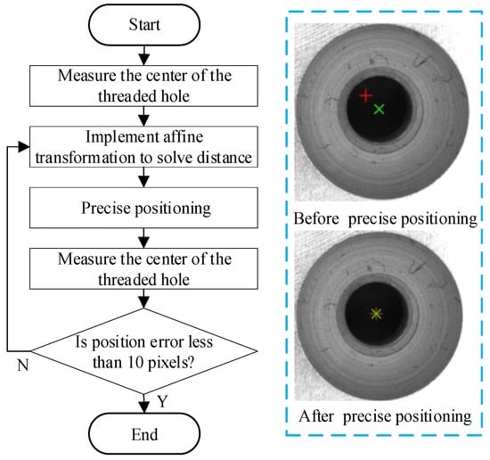 At this point, the center of the threaded hole is precisely positioned, as shown in Figure 13. The distance between the center pixel coordinate of the threaded hole and that of the image is gradually reduced by several iterations until the error becomes less than visual positioning accuracy. This ensures that the screw can be precisely installed to prevent damage to the threaded hole. The number of specific iterations is related to the absolute positioning accuracy of the manipulator. The higher the absolute positioning accuracy, the fewer the iterations.