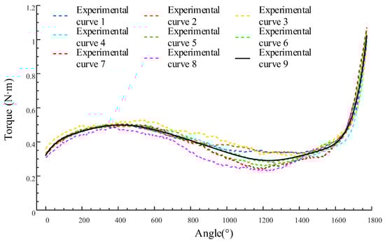 Through experiments, several angle–torque curves can be obtained during screw assembly. The curve representing a satisfactory screw assembly is selected as the reference curve, and point (xi, yi) on multiple reference curves is fitted by a polynomial given by Equation (11):