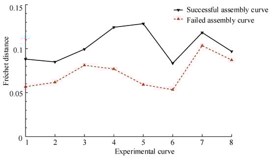 As shown in Figure 19, the black solid line represents the Fréchet distance between the eight experimental curves in Figure 18 and the successful assembly template curve, while the red dashed line represents the Fréchet distance between the experimental curves and the failed assembly template curve. It can be seen that there is a significant difference between the Fréchet distances of successful and failed assemblies, which prevents confusion. Therefore, the Fréchet distance can be used for judgment.