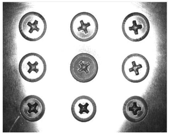 In the screw assembly process, the precise measurement of the central coordinates is necessary to ensure that the screw can be accurately assembled to avoid damage to the threaded hole. However, for some countersunk threaded holes, imaging may be irregular owing to the shielding of the upper cover plate and the lighting effect of the light source equipment. This can considerably affect the diameter and center coordinate measurement accuracies of the threaded holes. The threaded holes in the center of the image are not affected, as shown in Figure 8 and Figure 9. Accordingly, a visual servo-positioning strategy was developed. By repeatedly moving the camera until the threaded hole becomes the image center, the accuracy of feature extraction can be improved.