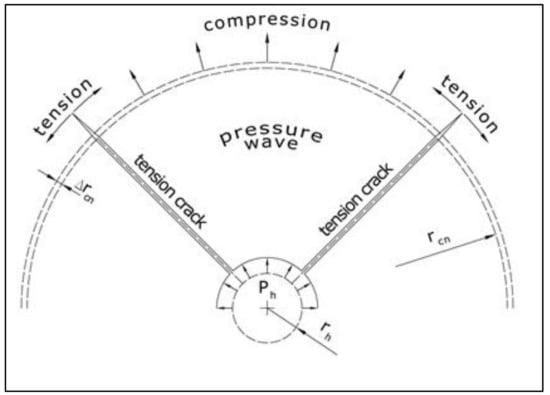 Explosive charge detonation generates a pressure wave that propagates in a cylindrical shape around the blast hole. The propagation of a high-energy pressure wave results in a tensile load between rock particles and the formation of tensile fractures. Any existing discontinuities in the rock medium will prevent wave propagation between rock particles since there is no physical connection between them. Therefore, preexisting rock mass joints will limit the length of blast-induced fractures if their infill is weaker than the primary rock medium or if there is no infill material.