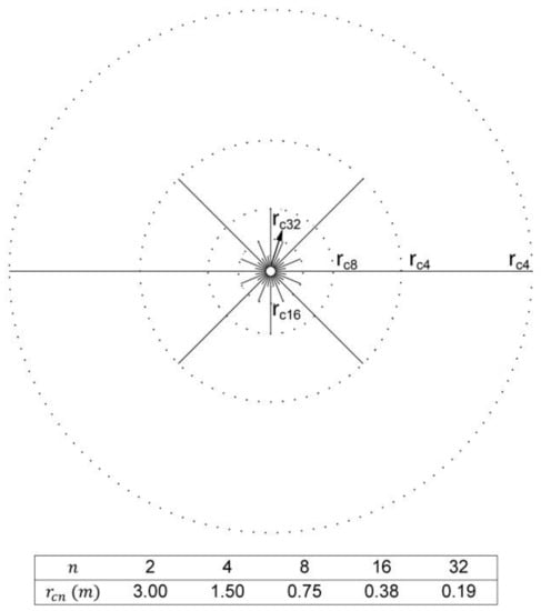 For a blasthole with radius and pressure in granite with a tensile strength of and Poisson’s ratio , the cracking zones are as presented in Figure 2.