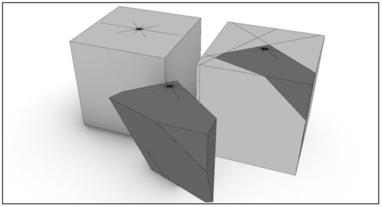 Secondly, blast-induced fractures are generated along the blasthole axis, with size and density explained in Section 2.1. Each filtered primary block is then subjected to the splitting process, where generated fractures are sorted in descending order by their size. Then, it is tested if the fracture completely splits a single block. If the fracture is not splitting the block completely, then the splitting of the block is determined by the percentage of the block being cut by that same fracture. If the area of intersection is more than 50% of the total cross-section area along that fracture, the block is split and vice versa. If the fracture splits a completely tested block, then two new blocks, now fragments, are created, and both of these new fragments are tested for splitting against remaining blast-induced fractures. If no new fragments are made from the current primary block, the splitting process is continued to the following primary block in sequence until all selected blocks are tested for splitting against blast-induced fractures from the current charge. This process repeats for every explosive charge in sequence.