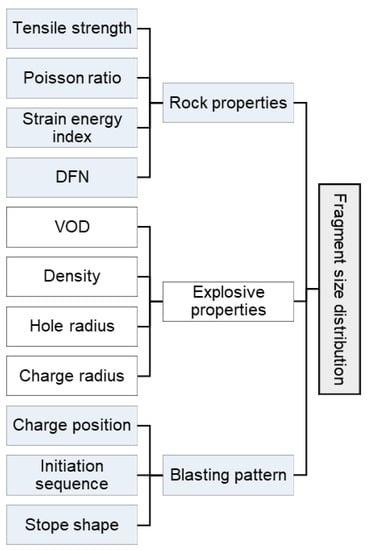 The fragmentation model was conceptualized to capture all input parameters of the blasting process, which are related to rock and explosive properties as well as the pattern being used. The rock properties required for the model are the tensile strength of monolith rock, its Poisson ratio, and strain energy recovery index. To model the blasting process in a representative geological setup, discrete fracture network (DFN) was used to represent the structure of the rock mass and its primary blocks.