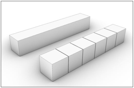 This process consists of analyzing each fragment and determining its elongation or thickness, assuming the resulting fragments will be close to an isometric shape. Fragment dimensions are determined along its axes; if the ratio between the longest and shortest axis exceeds 1.5 fragment, it is then split into halves at the middle of the long axis. This iterative process repeats until all newly formed fragments satisfy the defined criteria. Figure 12 illustrates this procedure and its outcome.