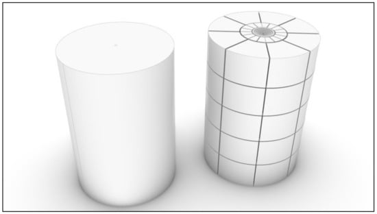 Even if not used besides in research, the first application case is the possibility of modeling fragmentation of specimen-sized monolith rocks blasted in a laboratory environment. Such cases are reported in the literature [26] and are used for blasting process optimization where laboratory results are scaled up to the in situ application. Figure 13 illustrates an example on a laboratory-scale rock specimen blasted with a single explosive charge along the specimen’s long axis.