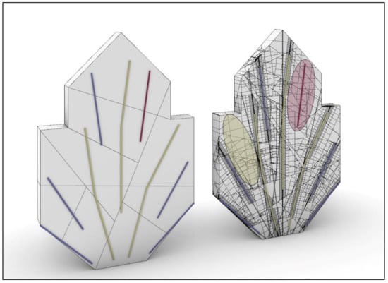 As previously said, only blocks intersecting with the borehole and containing an explosive charge within will be fragmented by explosive detonation. Figure 9 illustrates the process of model geometry preparation, where the block to be mined is split by preexisting joints, and a set of primary blocks is defined. In the next step, explosive charges are incorporated into the model. As can be seen, some of the primary blocks do not or only partially contain an explosive charge inside them.