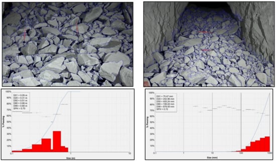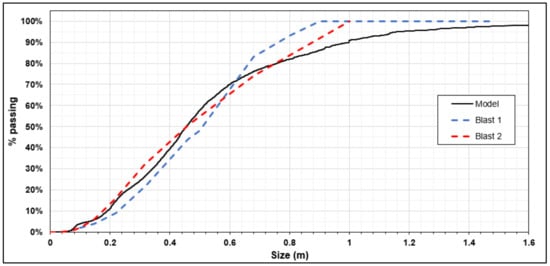 The size range above X80 shows that model prediction has increased relative error in both cases, where the comparison with blast B1 has a 31.58% difference, and B2 has only 13.64%. The maximum estimated value according to the model is significantly higher than those measured in situ. Even though this is only a small fraction of the total muckpile maximum size, this may imply the necessity for further scaling of the material. Reasons for this discrepancy may be found in the model and the image processing size distribution methodology. As with any other digital model, the first model may provide errors due to imperfections and inevitable simplifications of reality. In other words, capturing exact in situ conditions and representing them within models is still impossible. Also, due to its nature, the mining industry is one of the few where data variations are increased. Another possible reason for the discrepancy between the maximum sizes may be that by image processing methodology, one captures only one part of the muckpile that is available for photographs. This means that the actual fragment size may differ from the one that is determined, and some fragments are not shown, as they are found within the deeper part of the muckpile.