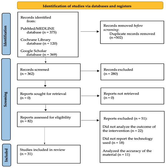 A total of 864 records were retrieved from PubMed/MEDLINE (375 articles), Google Scholar (369 articles), and the COCHRANE library (120 articles). Of these, 502 were excluded because duplicates or full texts were unavailable. Of the remaining 362 records, 280 were not relevant, and 82 full texts were screened; 51 entries were also excluded because the evaluation of the full texts did not reveal study outcomes or intervention methods. Finally, 31 articles were included in the qualitative analysis.