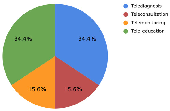 The analyzed studies were then subdivided according to the type of teledentistry application(s) assessed (Figure 2). Eleven studies assessed the use of telediagnosis in children, while n = 11 studies evaluated tele-education, n = 5 telemonitoring, and n = 5 teleconsultation, respectively.