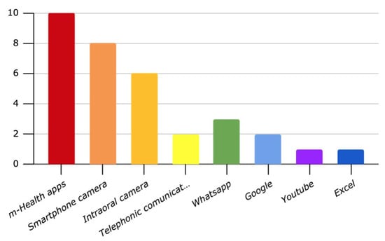 In addition, the studies were divided according to the digital support used (Figure 3) for teledentistry applications in pedodontic patients: 10 studies used mobile health applications; 8, smartphone cameras; 6, intraoral cameras; 3, WhatsApp; 2, the Google platform; 2, telephone communication; 1, YouTube; and 1, Excel. Mobile health applications were most commonly used for oral health education and promotion in pediatric patients. Smartphone cameras and intraoral cameras were the most commonly used tools for remote diagnosis.