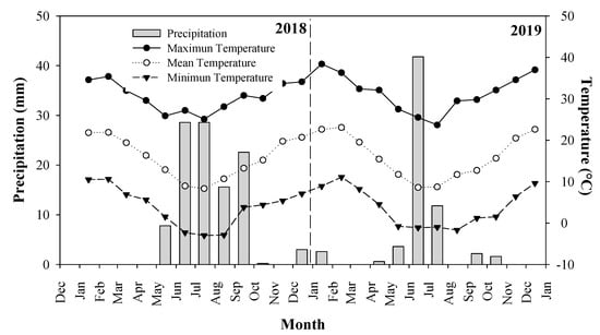 Monthly mean, minimum, and maximum temperatures (lines) and precipitation (bars) during the study period (2018–2019) (Source: Estación Peldehue, www.agromet.cl, accessed on 1 October 2022).