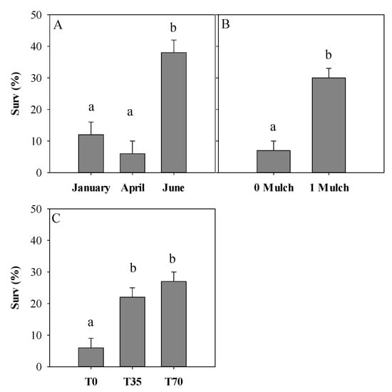Mean survival per planting month (A), mull application (B), and shading level (C). 0 Mulch: no mulch application; 1 Mulch: mulch application. T0: full sun, T35: shade at 35%, T70: shade at 70%. Different letters indicate significant differences according to Šidák’s test.
