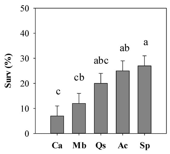 Mean survival per species. Ca: C. alba, Mb: M. boaria, Qs: Q. saponaria, Ac: A. caven, and Sp: S. polygamous. Different letters indicate significant differences according to Šidák’s test.