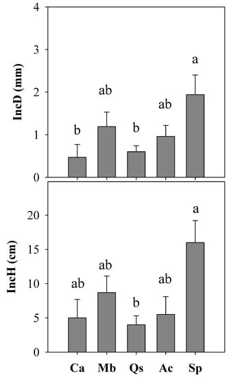 Mean increment for diameter (IncD) and height (IncH) per species (main effect). Ca: C. alba, Mb: M. boaria, Qs: Q. saponaria, Ac: A. caven, and Sp: S. polygamous. Different letters indicate significant differences according to Šidák’s test.