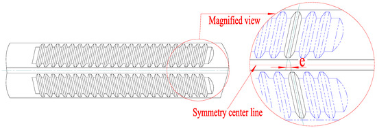 Spatial symmetry errors in herringbone gears come from deviations in the starting machining position between the upper and lower teeth. If the involute curve of a herringbone gear is enlarged indefinitely, the shape of the herringbone gear will be similar to an oblique gear rack, and the actual spatial symmetry error shown in Figure 1 will be the offset error of the center position for the upper and lower teeth. Thus, the spatial symmetry error of the herringbone gear shown in Figure 2 can be assumed to be a circular angle error. Therefore, in order to identify a herringbone gear’s spatial symmetry error, it is important to calculate and acquire the circular angle error of the upper and lower teeth through measurement and calculation using a mathematic model.