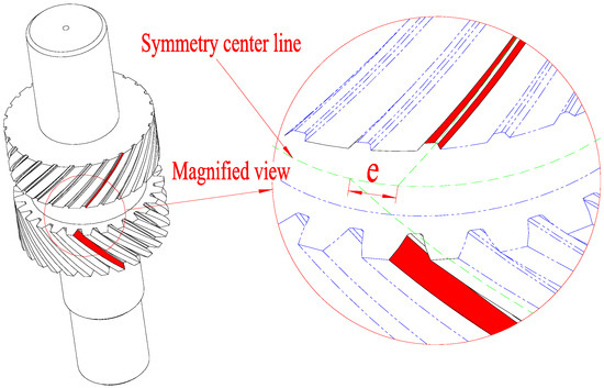 Modern gear transmissions are being developed for higher speeds and heavier loads, which pose higher requirements for the static accuracy and dynamic performance of gears [1,2,3]. As an important transmission component, herringbone gears are widely used in high-speed, heavy-duty, and high-power transmission systems such as aviation and vessel transmission equipment and other mechanical transmission areas because of their advantages in transmission stability and strong bearing capacity [4,5,6]. Therefore, high accuracy in the manufacture of herringbone gears is increasingly required [7,8,9,10]. Even more, the spatial symmetry of herringbone gears directly affects transmission errors, transmission efficiency and service life, which are significant for transmission systems [11,12]. At present, tooth profile and tooth direction modifications are research priorities that can improve the stability of and reduce vibrations in gear transmission systems [13,14,15,16,17]. Thus far, manufacturers have lacked a high-precision and high-efficiency control processing method for on-line detection and compensation of spatial symmetry errors in herringbone gears [18].