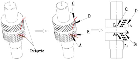 To improve machining efficiency in the detection and compensation process, actually, the quantity of detected points can be reduced to two points for each tooth surface. Because the gear shaping cutter has high accuracy and the processed helix angle is constant, the three-dimensional spatial symmetry error can be reduced to a one-dimensional displacement deviation. Meanwhile, in order to compare and validate the detected data, it is necessary to detect two points for each tooth surface. Hence, in the actual machining process, the spatial symmetry error amount is calculated based on the data for a total of eight detected points on four tooth surfaces.