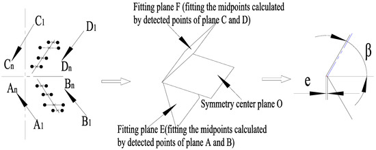 The fitting symmetry plate E and F can be calculated based on spatial analytic geometry and the calculated midpoint sets. The equations of plane E and F can be formulated as follows:
