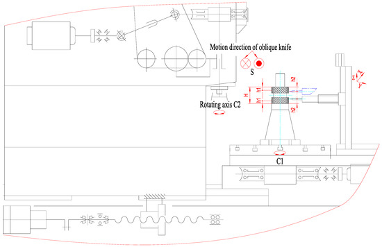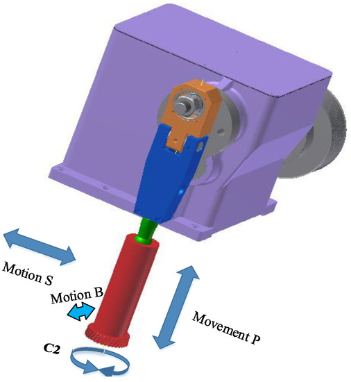 As shown in Figure 5, the movements of the gear shaping cutter mainly include the principal cutting movement (P), circular cutting motion of numerical control (NC) axis C2 (C2), cutter back-off motion (B) and movement of oblique knife (S). Apparently, the angle error compensation of the tangential direction cannot be realized through controlling movement P; moreover, the simplex control of movement C2 can make tangential displacement in the gear machining process, and the motion B only involves the axial direction because the spatial symmetry error is translated into displacement deviation at the X-axis coordinate. Therefore, the method of controlling movement S is proposed to compensate for the displacement deviation , and this method is viable to compensate for the tangential displacement through approximation in theory. The compensation model of the herringbone gear’s spatial symmetry error is shown in Figure 6. Finally, the whole closed loop system of measurement and compensation machining on the herringbone gear’s spatial symmetry error is realized.