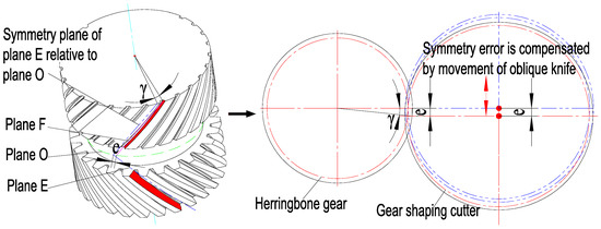 On the basis of the proposed compensation model for the herringbone gear’s spatial symmetry error, the spatial symmetry error is translated into displacement deviation and can be written as follows. Further, the movement of the oblique knife is adjusted, and then the gear shaping cutter should be adjusted to confirm the mesh after compensating for the spatial symmetry error. The angle can be written as follows: