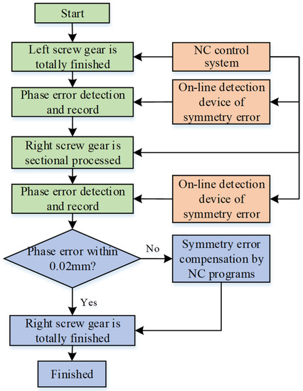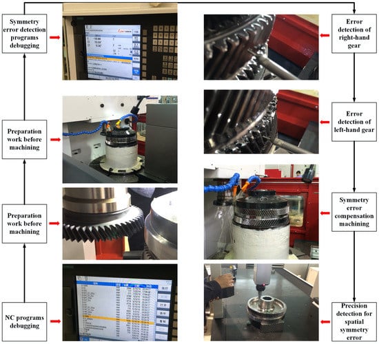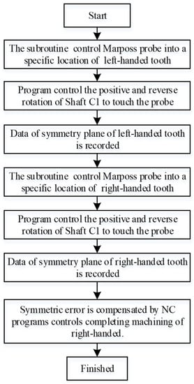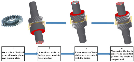 According to the above analysis, a machining flow chart for a herringbone gear based on SSEDC is proposed, combined with the machining process for the gear, as shown in Figure 7. The key point in the machining process is to achieve detection through a measuring device and control it to detect the phase symmetry of the upper right-hand and lower left-hand groove center of the herringbone gear. Then, on the basis of the proposed method, the spatial symmetry error can be calculated and compensated in the machining process.